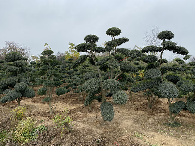 小葉女貞造型樹,看似簡單隨意的剪扎,每一株都凝聚師傅們的心血。即為景,一定有其獨特之處,每一株造型樹都不相同。這是盆景以奇、斜、怪、獨為美的追求,也是根據植物隨意生長的株型,而個性制作。多數為云片壯,一棵樹有8片以上,樹高從1.2~5米不等,樹干粗度不定。雖然經過特定造型,但是其本性沒變,還是小葉女貞,主要特定還是那樣,只是在養護管理上,需要定期修剪,殺蟲,管理工夫要大一點。